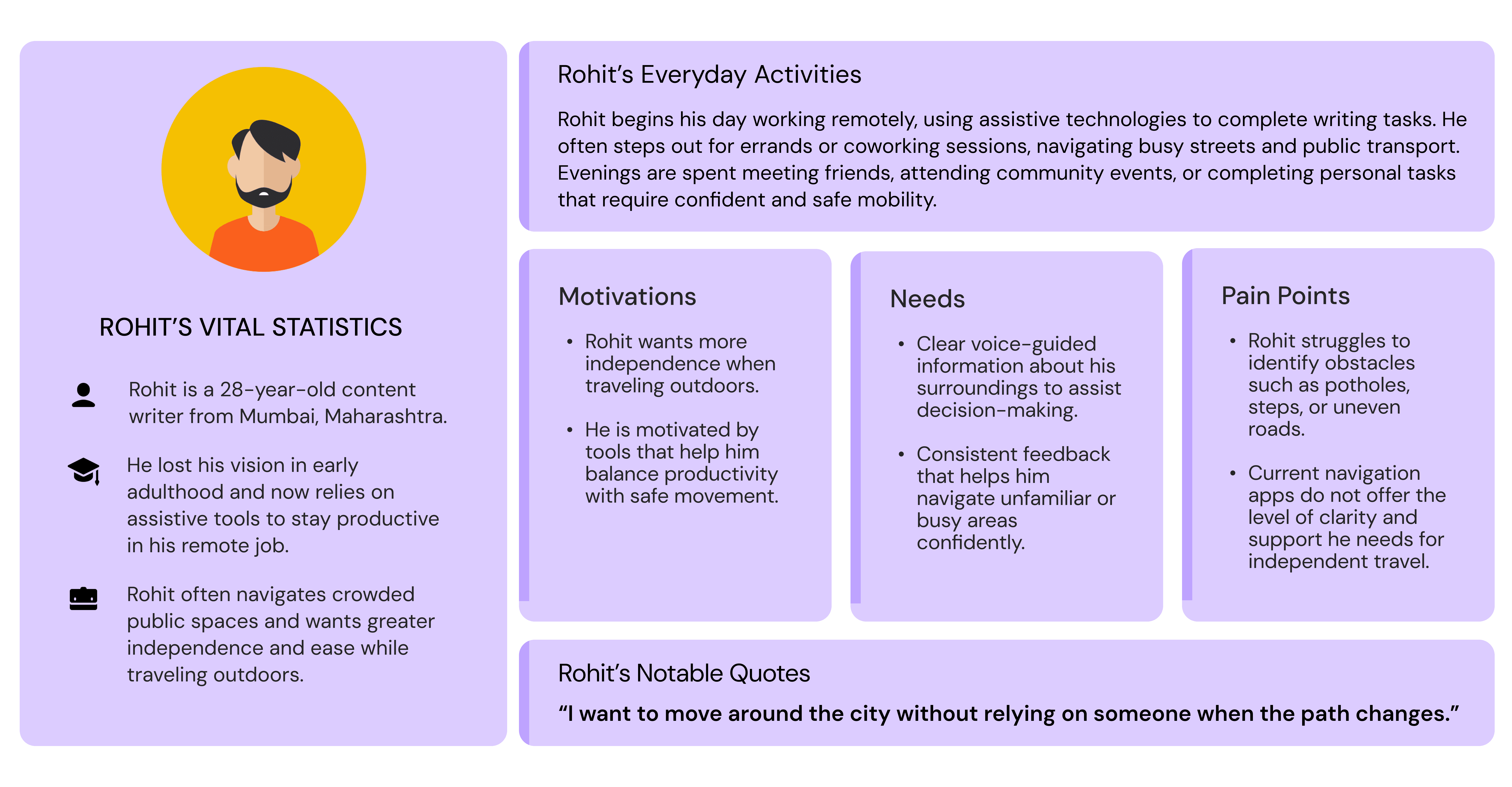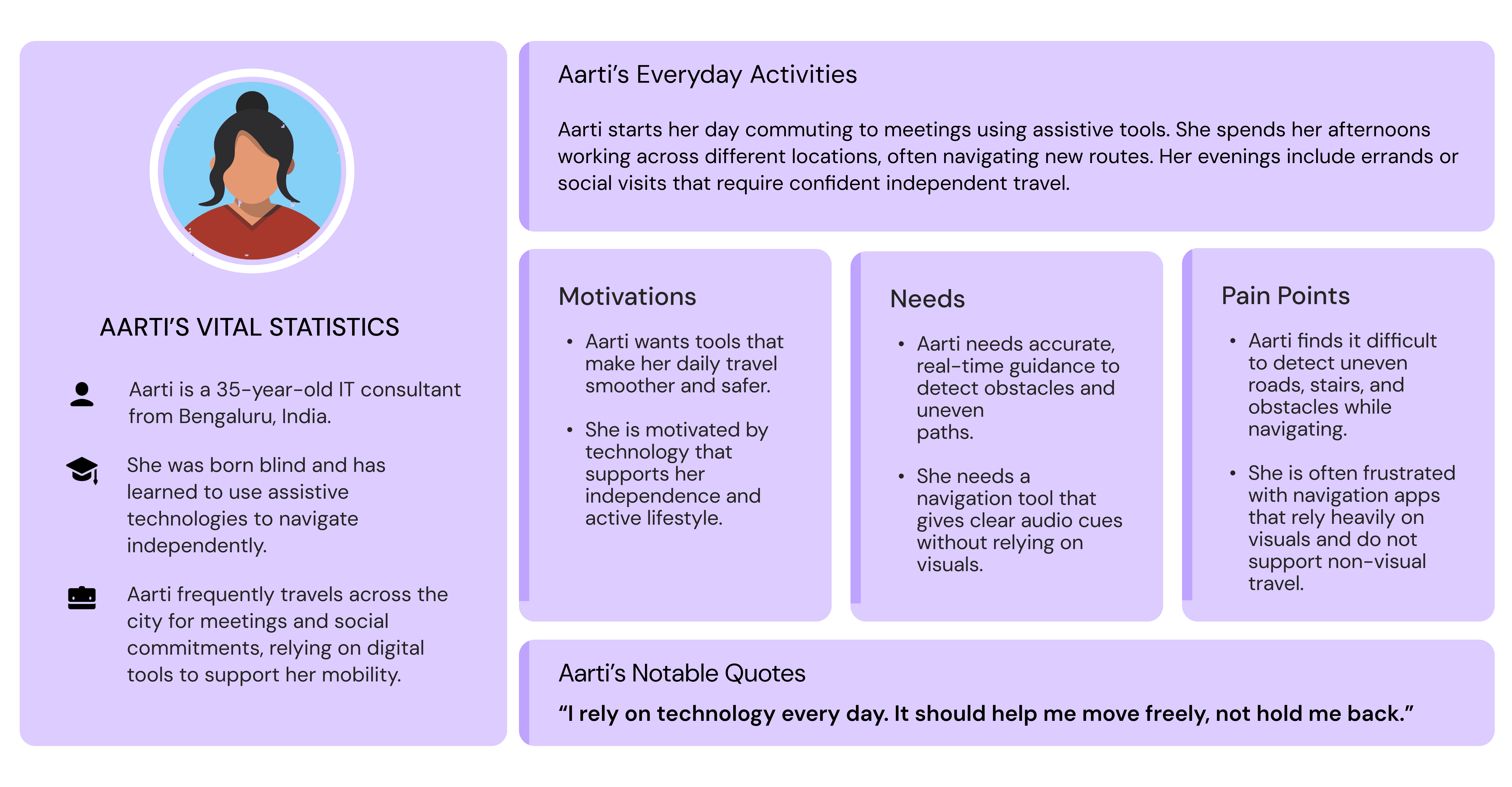 To build meaningful personas for INDI, I focused on understanding how visually impaired users navigate their daily routines and the challenges they face with existing tools. By engaging directly with users through accessibility communities and conversations, I gathered insights that revealed their goals, frustrations, and expectations from assistive technology. This helped me shape personas that accurately represent their lived experiences and mobility needs, ensuring the design direction stays grounded in real user behavior.